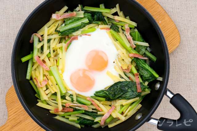 ベーコンがアクセント小松菜とじゃが芋の巣ごもりたまごのレシピ ソラレピ